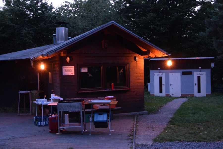 | In der Zwischenzeit bereiteten die anderen die Imbiss-Station an der Grillhütte vor: Brötchen schneiden, ... | ![]() Bild vergrößern |