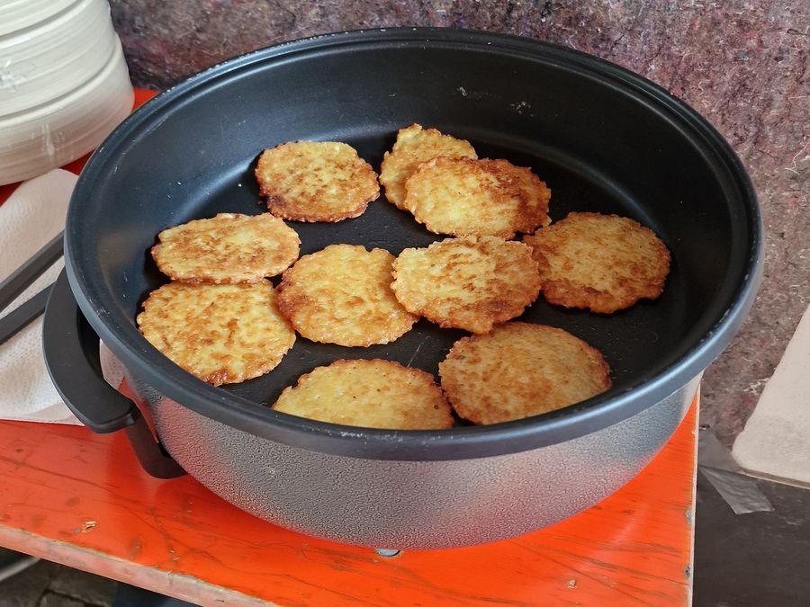 Rechtzeitig vor Eröffnung kamen die ersten Kartoffelpuffer in die Pfannen, ... |