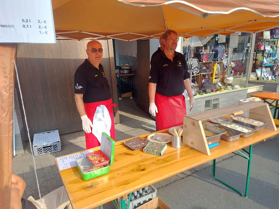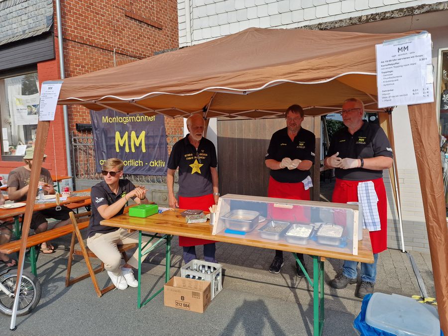 Nachdem wir im Juli des vergangenen Jahres das letzte Konzert in der Volkshalle in Ehringshausen veranstaltet hatten, wollten wir in diesem Jahr wieder etwas für unsere Mitbürger tun. Nach reiflicher Überlegung entstand der Entschluss, uns aktiv am Straßenfest im August zu beteiligen. Und da wir des Kochens nicht unkundig sind, wie jeder schon an den warmen und kalten Imbissen nach den Konzerten feststellen konnte, entschieden wir uns dazu, ein Abendessen anzubieten. Bratwurst, Steak und Pommes gibt's immer. Also musste ein besonderes Angebot her. So entstand die Idee, Kartoffelpuffer mit verschiedenen Belägen, neuhochdeutsch "Toppings" anzubieten. |